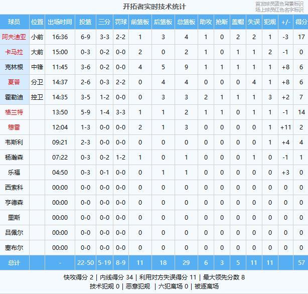 开拓者方面:阿夫迪亚17分4板1助2帽、格兰特14分2板2助、霍勒迪7分3板2助、克林根6分9板1助、夏普6分4板、韦斯利4分、穆雷2分3板、杨瀚森1分1板、卡马拉2板1助、乐福1板